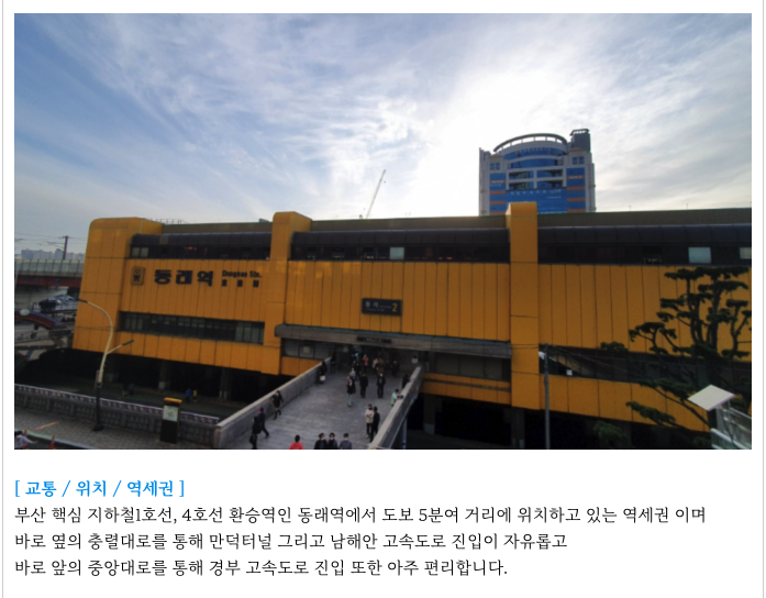 부산 지하철1호선, 4호선 환승역인 동래역 5분여의 역세권 이며