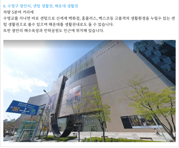 신세계 백화점, 롯데 백화점, 영화의 전당, 벡스코가 있는 센텀지구로 차량 3~5분이면 접근이 가능하며