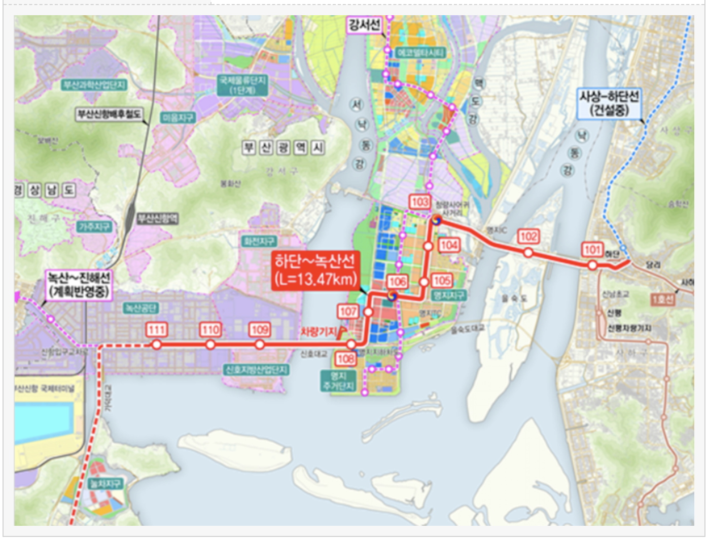 - 하단녹산선은 현재 예비타당성이 통과하여 기본 계획 고시후에 국토부 승인을 앞두고 있는 곳으로