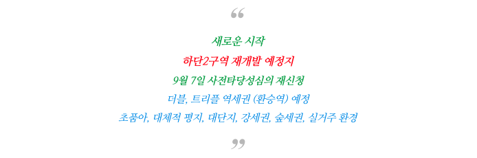 하단역을 도보 이용가능한 역세권으로 약 2000여세대의 대단지로 예정하고 있습니다.