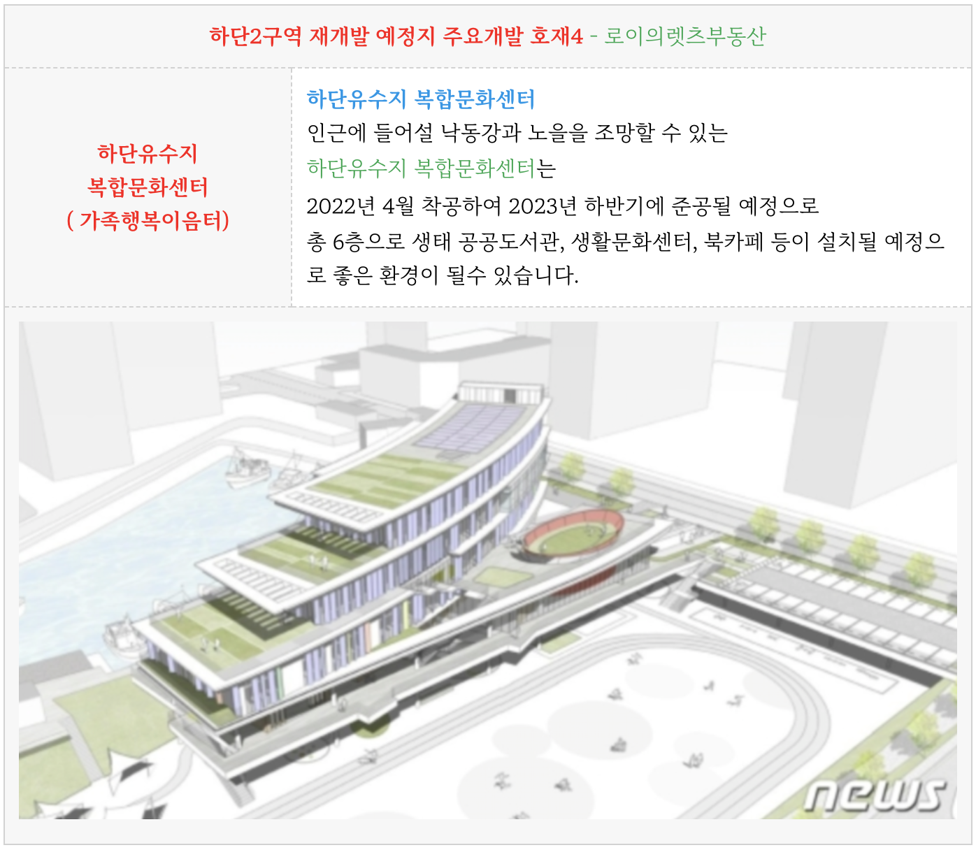 하단유수지복합문화센터 ( 가족행복이음터 )는 하단의 주요 문화 센터로 실거주에서의