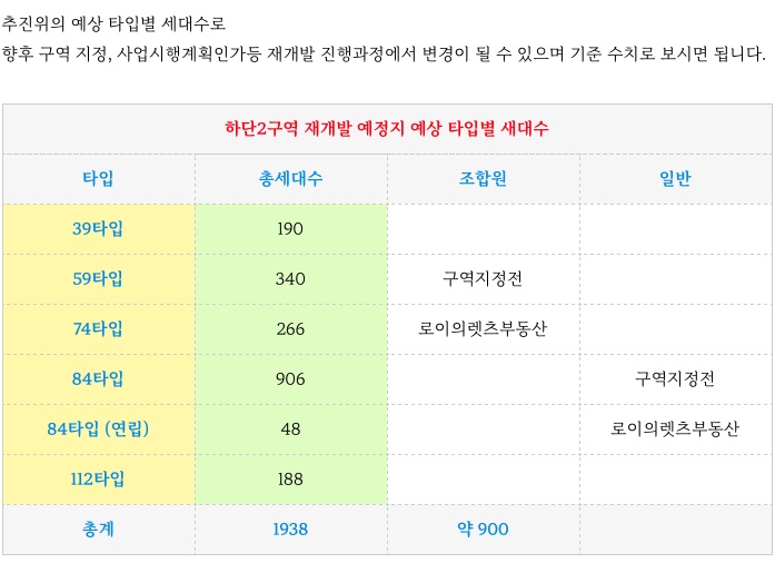 하단2구역 재개발 예정지 의 예상 타입별 세대수 입니다.