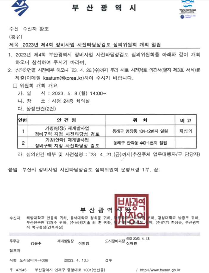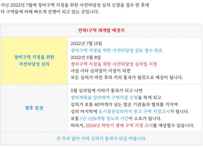 추진위 구성 2달여 만인 지난 7월에 정비구역 지정을 위한 사전타당성 심의 신청이 되었고