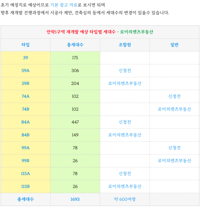 안락1구역 재개발 예정지의 추진위의 예상 타입별 세대수 입니다.