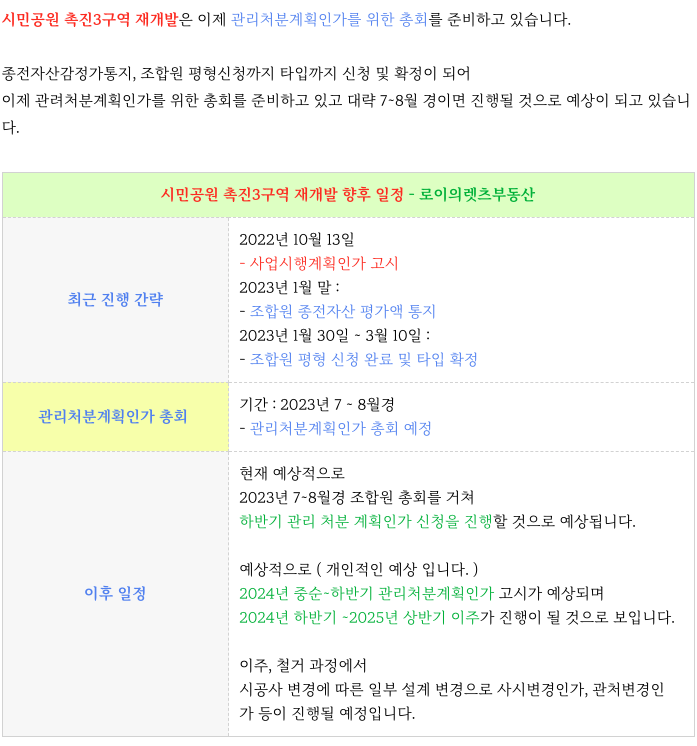 시민공원 촉진3구역 재개발 관처총회 예상 일정 & 현재 가능한 매물 소개해 드리겠습니다.