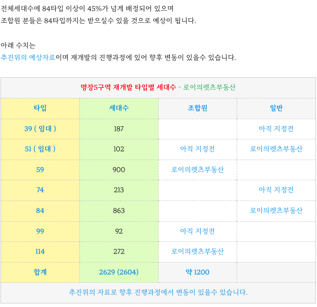 명장5구역 재개발 예정지의 추진위의 예상 타입별 세대수 입니다.