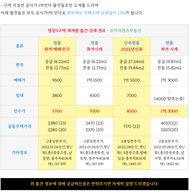 명장5구역 재개발 예정지의 시장 최저 소액 물건들 정보 정리 소개해 드립니다.