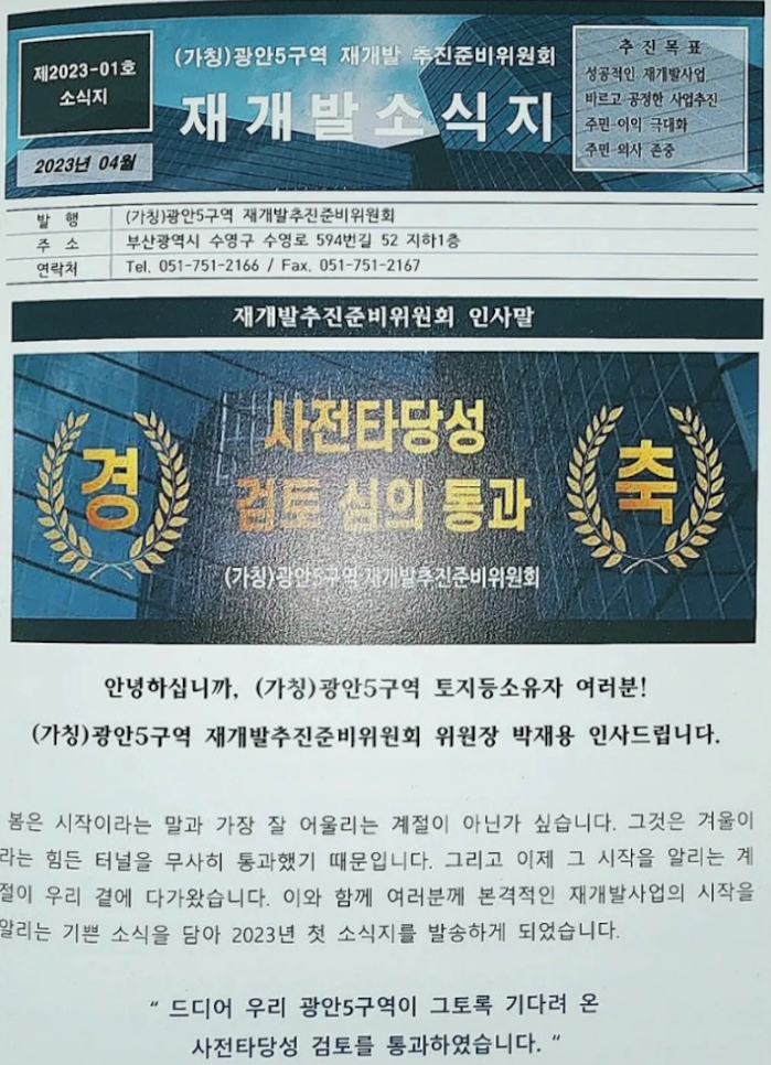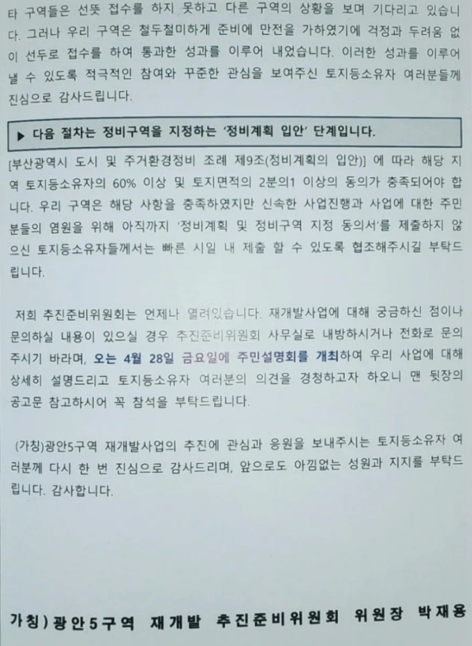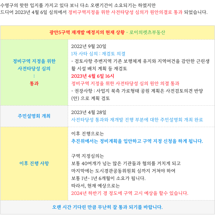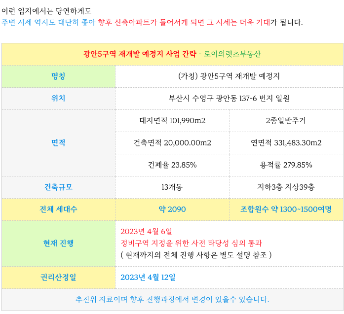 광안5구역 재개발의 현재까지의 초기 진행상황 정리등 추가 정보는 아래 페이지를 참고 부탁드립니다.