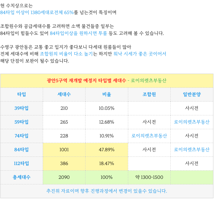 광안5구역 재개발 예정지의 추진위 예상 타입별 세대수 입니다.