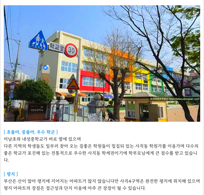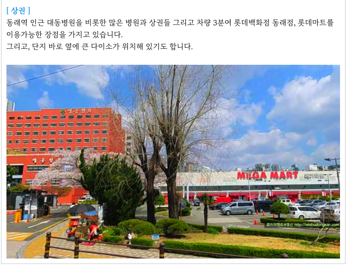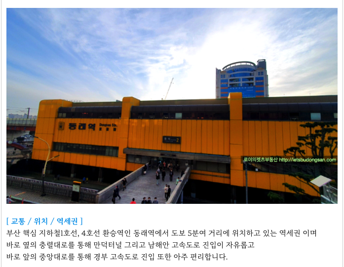 - 동래역 역세권, 초품아, 중품아, 학군좋은, 평지, 온천천, 동래 상권 등