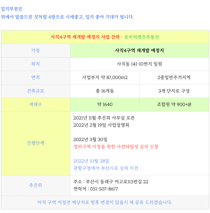 사직4구역 재재발 예정지에 대해 궁금하신 점은 연락주시면 자세히 설명 드리겠습니다.