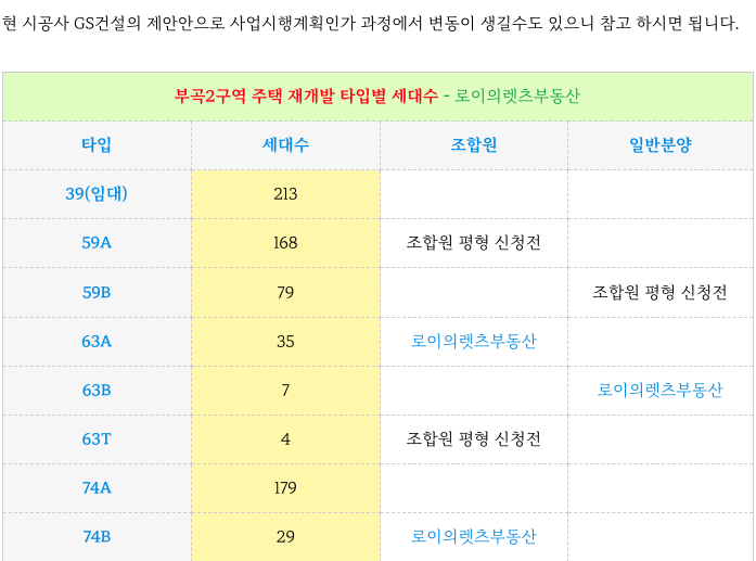 부곡2구역 재개발의 타입별 세대수 입니다.