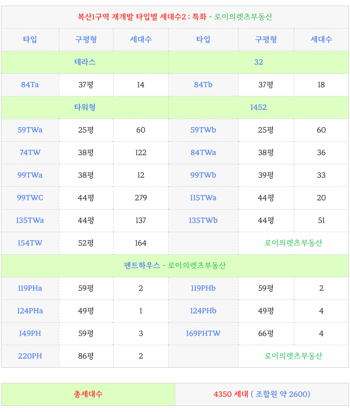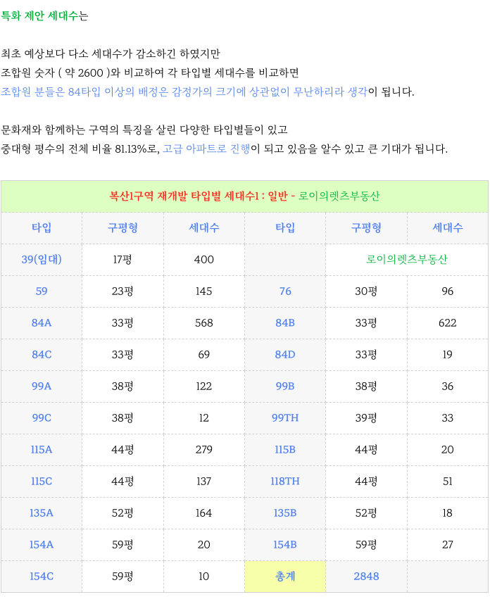 동래구 복산1구역 재개발 GS건설의 특화 제안에 따른 각 타입별 세대수입니다.