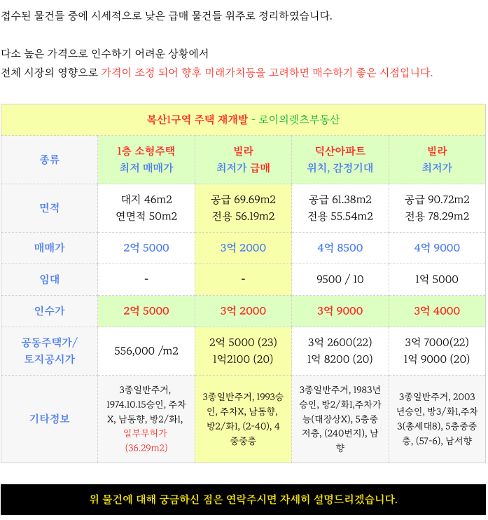 미래가치 "복산1구역 재개발" 2.5 주택, 3.2빌라 급매