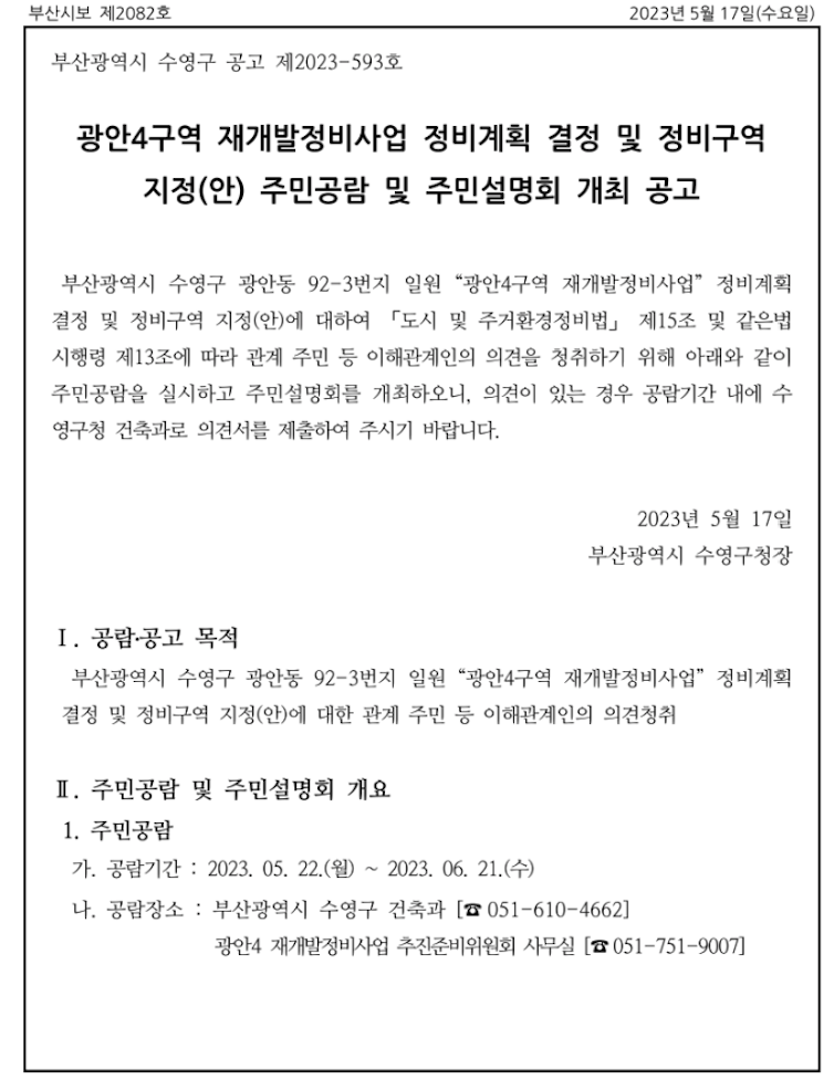 광안4구역 재개발 예정지 공람 공고 그리고 현 소액 매물