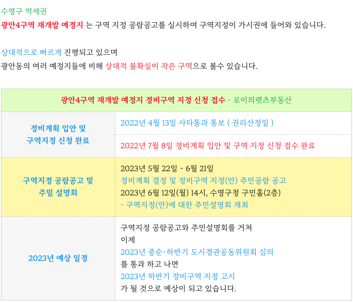 광안4구역 재개발 예정지 구역 지정 공람 공고 소식과 현 소액 매물을 소개해 드리겠습니다.