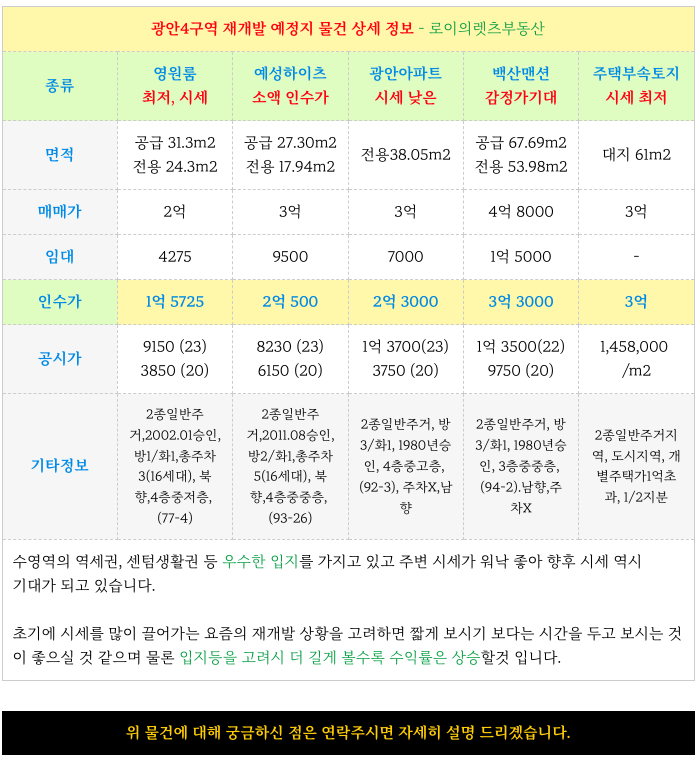 광안4구역 재개발 예정지 인수가 작은 소액 매물 소개해 드리겠습니다.