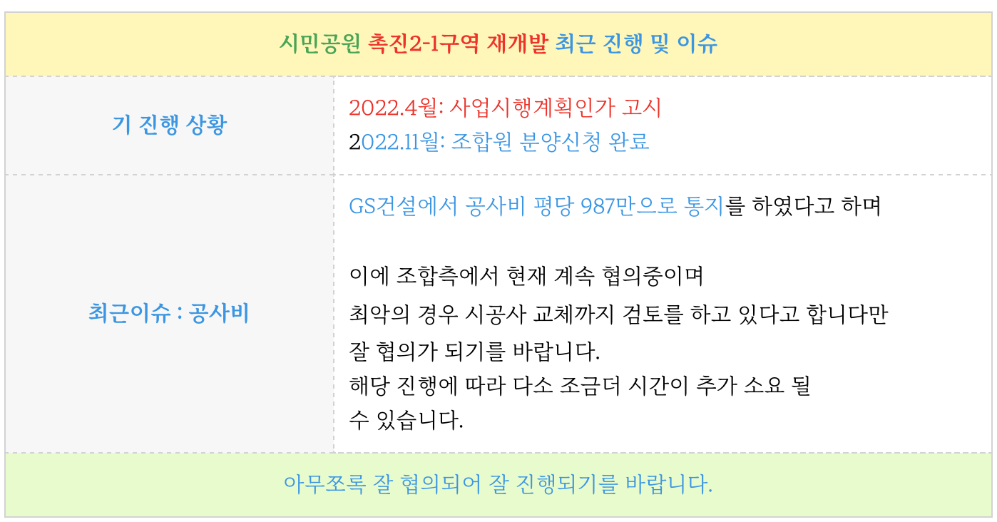 시민공원 촉진2-1구역 재개발의 현재까지의 진행상황 간략 및 향후 일정등 추가 정보는 아래 페이지를 참고 부탁드립니다.