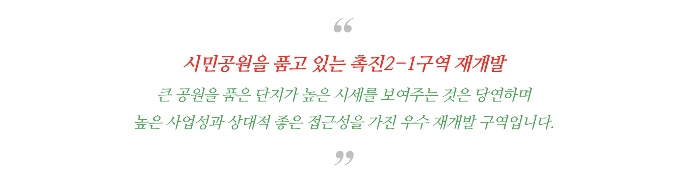 전세계 어디든 큰 공원을 끼고 있는 단지가 높은 시세를 보여 주었듯이 촉진2-1구역의 향후 시세 역시도