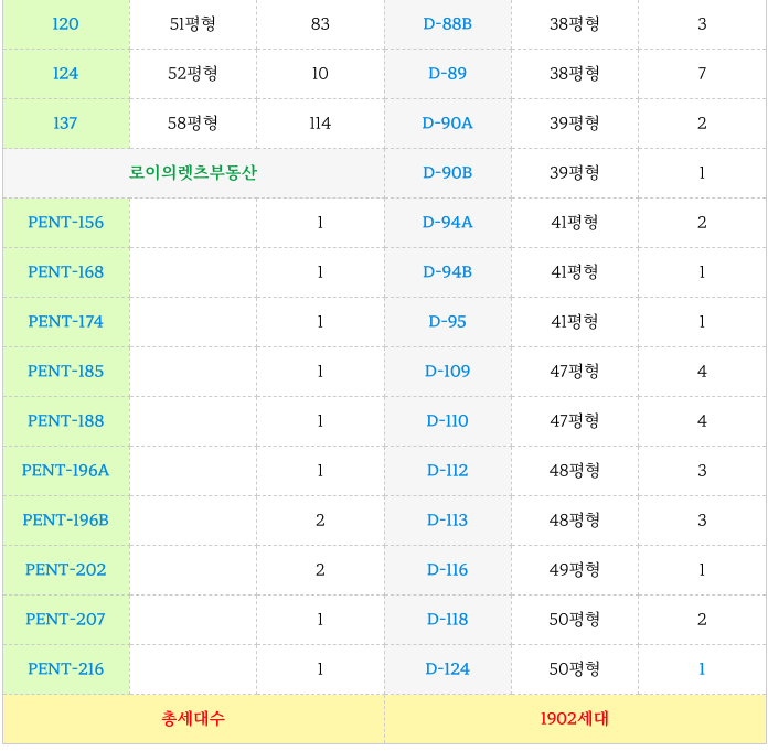 시민공원 촉진2-1구역 재개발의 타입별 세대수 입니다.