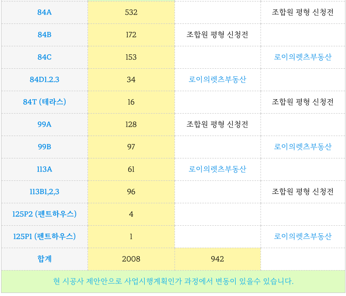 부곡2구역 재개발의 타입별 세대수 입니다.