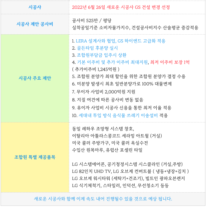 2022년 6월 26일 새로운 단독 시공사로 GS 건설 ( 자이 더 센터니티 ) 으로 변경 선정 하였습니다.