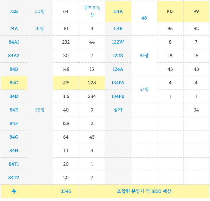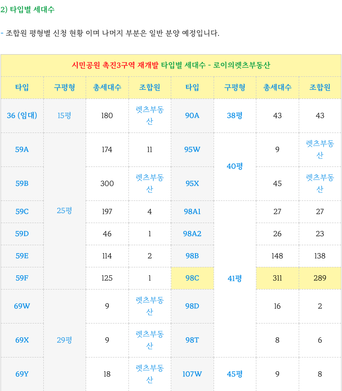 시민공원 촉진3구역 재개발 의 각 타입별 세대수 및 특징입니다.