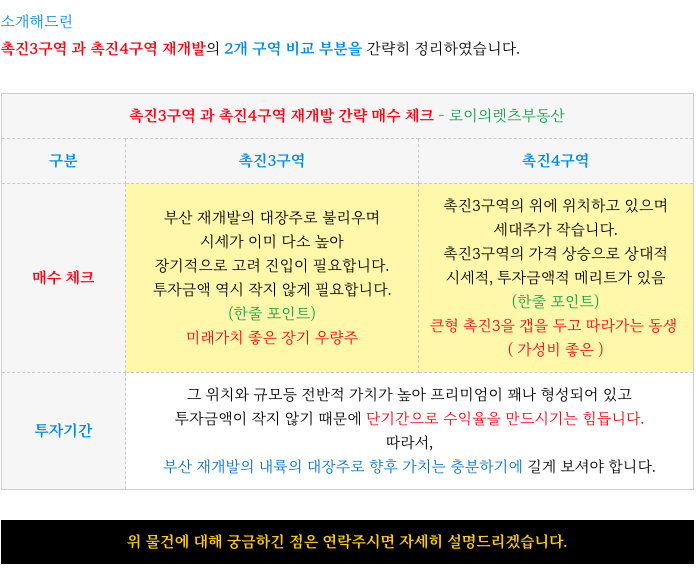 부산 전역 재개발, 재건축, 분양권, 상가, 주택 등 물건 투자 접수 받습니다