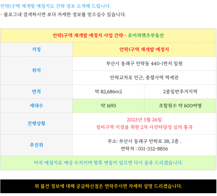 | 동래구 안락1구역 재건축 일정 그리고 84타입 피 1.28 급매 (0) | 2023.06.02 |