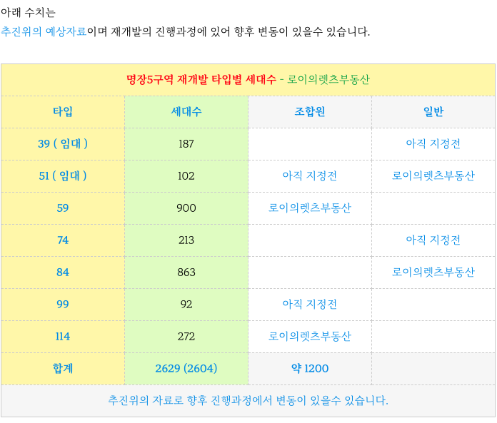 명장5구역 재개발 예정지의 추진위의 예상 타입별 세대수 입니다.