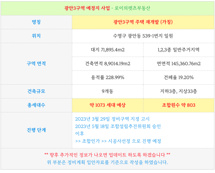 수영구 광안3구역 재개발 의 현재까지의 진행상황 정리등 추가 정보는 아래 페이지를 참고 부탁드립니다.
