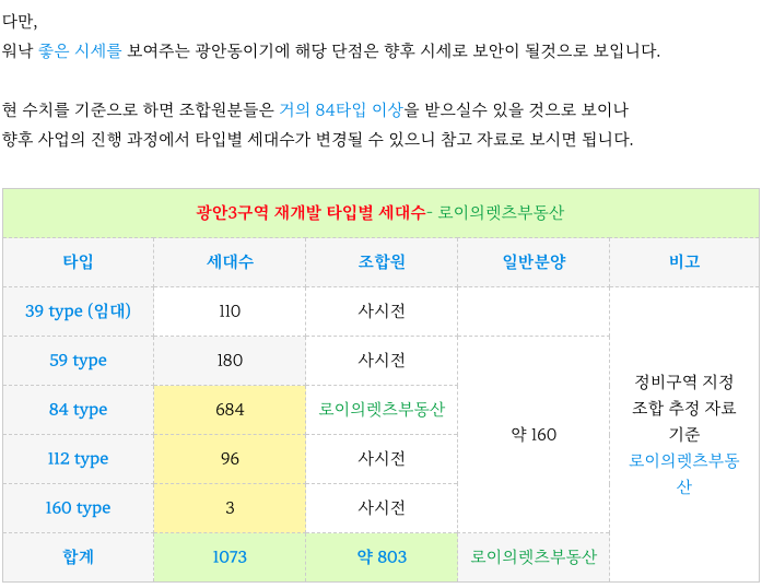 수영구 광안3구역 재개발 타입별 세대수 입니다.
