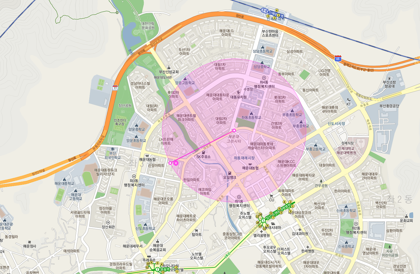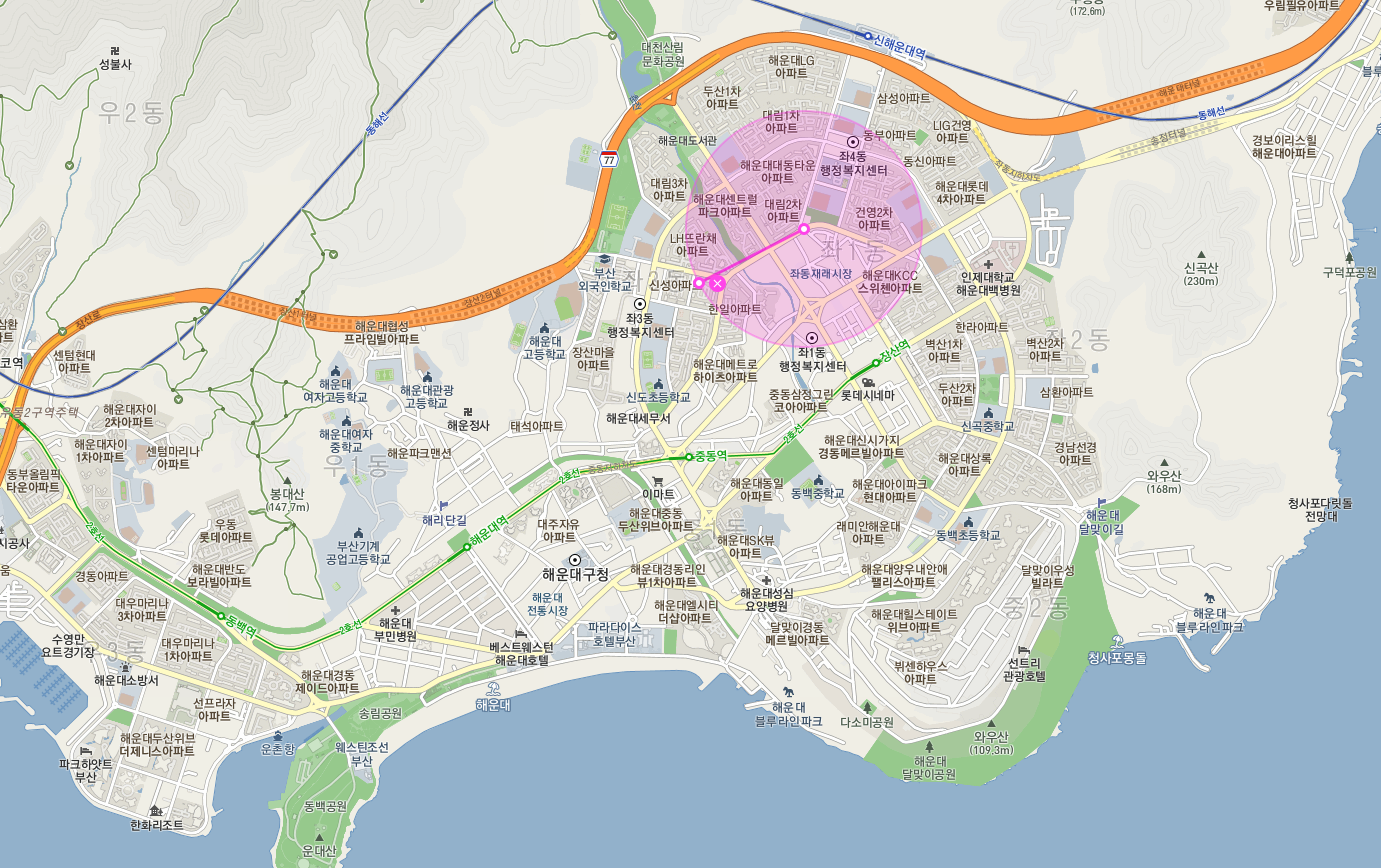 - 해운대 좌동 대단지 아파트들 사이 위치