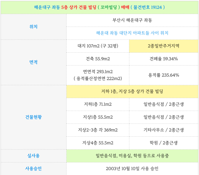 오늘 해운대구 좌동 5층 상가 건물 빌딩 ( 꼬마빌딩 ) 매매 물건 정리 해드립니다.