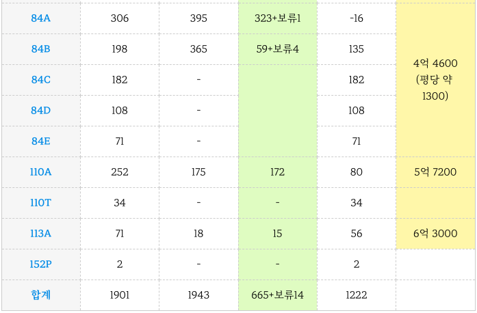 가야1구역 재개발 ( 더 다이너스티 가야 )의 타입별 세대수 입니다.