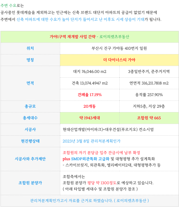 안녕하세요. 로이의렛츠부동산 ( 제이에이케이 부산 부동산중개법인 ) 입니다. 가야1구역 재개발 간략 특징...