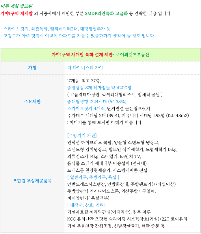 고급화 및 대형 평형 세대수 추가와 SMDP 외관특화/고급화 제안 과 예상 조감도 등이 새롭게 제시 되었고