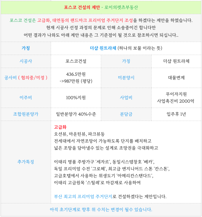 시공사 선정 소송이 진행중이나 현재 법적 지위를 확보한 시공사는 포스코 입니다.