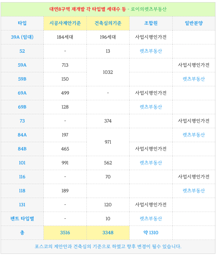대연8구역 재개발 의 각 타입별 세대수 입니다.