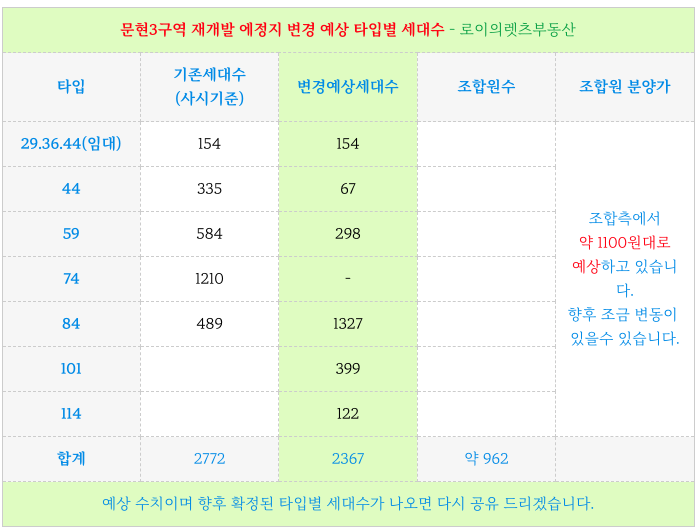 아래 수치는 관처시 기준의 타입별 세대수와 변경예상수치이며 향후 확정된 변경 타입별 세대수가 나오면 다시 공유 드리겠습니다.