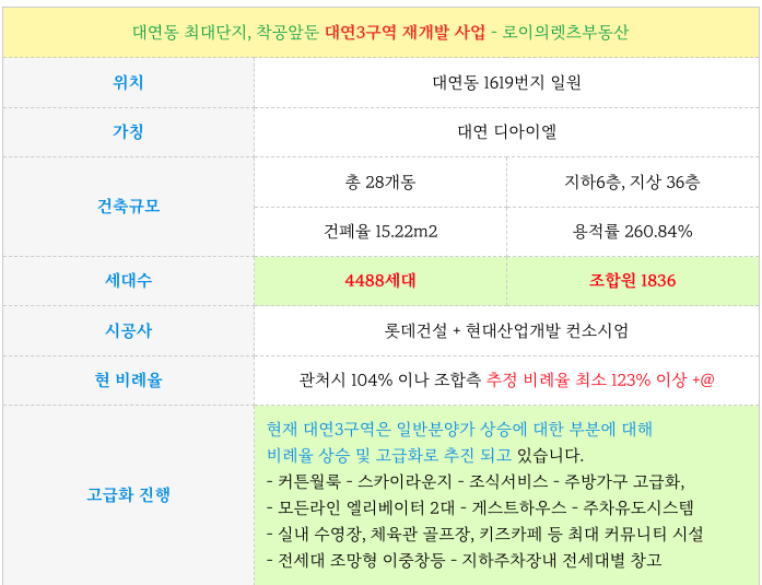 대연3구역은 재개발은 대연 디아이엘 이라는 이름으로 일반 분양을 앞두고 있습니다.
