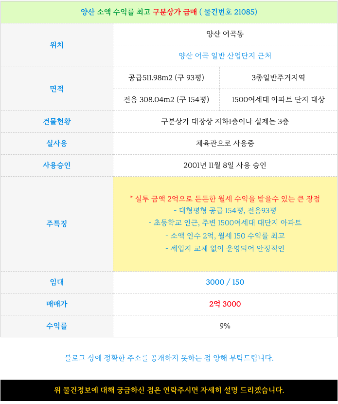 소액 수익률 높은 대평평수 양산 구분 상가 매물