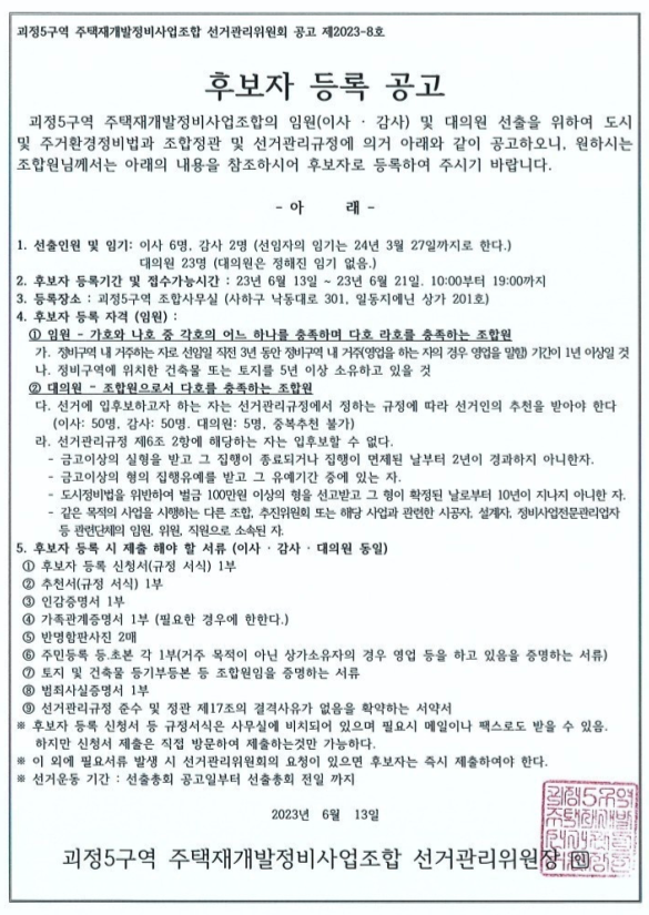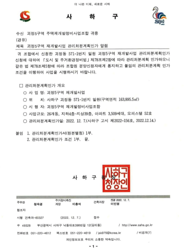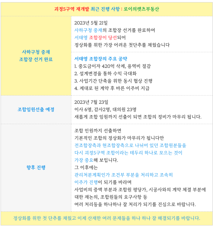 괴정5구역 재개발의 가장 어려운 문제였던 조합장 부분이 해결이 되었습니다.
