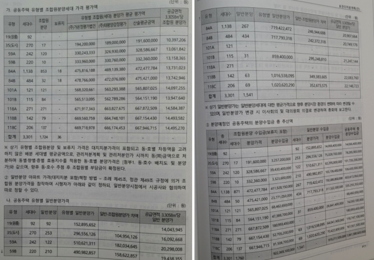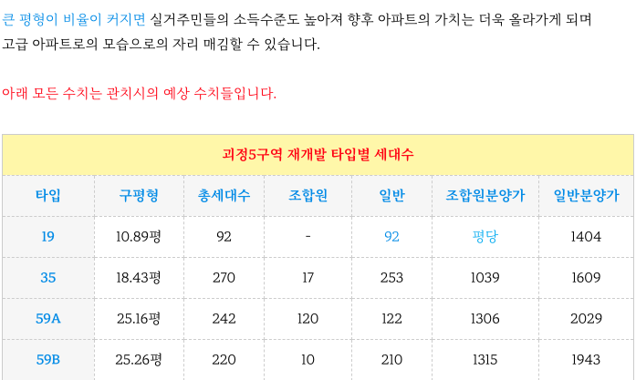 괴정5구역 재개발의 각 타입별 조합원 분양가와 세대수 입니다.