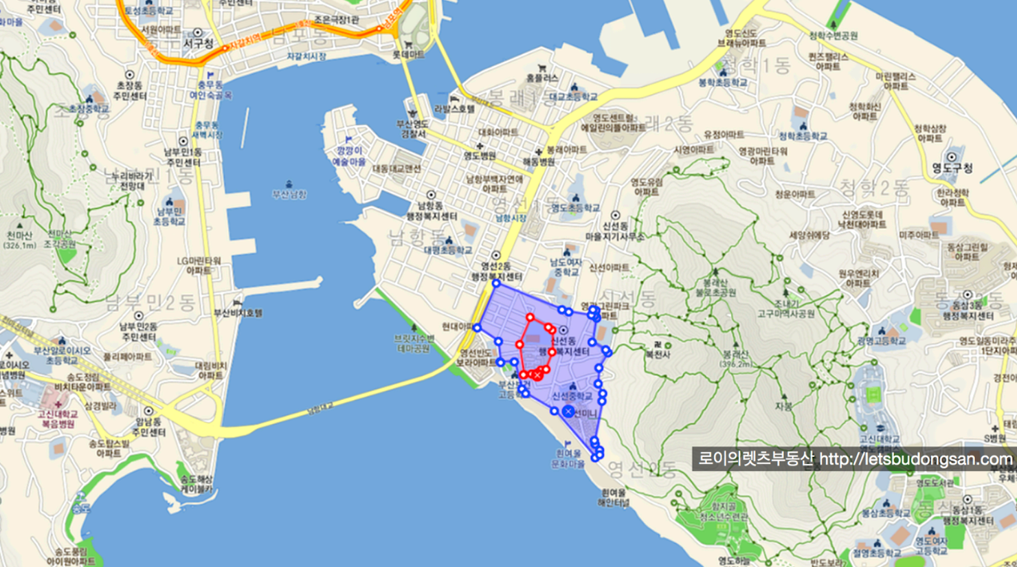 영도5구역을 가로지르는 도로와 남항초와 대원아파트를 기준으로 2개 블록으로 나뉘어져 있는데