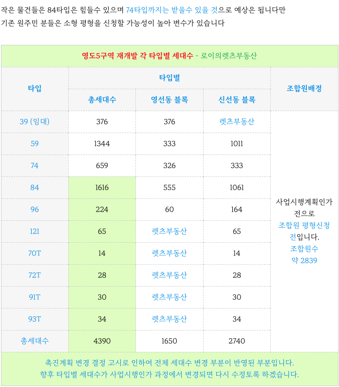 영도5구역 재개발의 변경결정고시 기준를 통한 타입별 세대수 입니다.