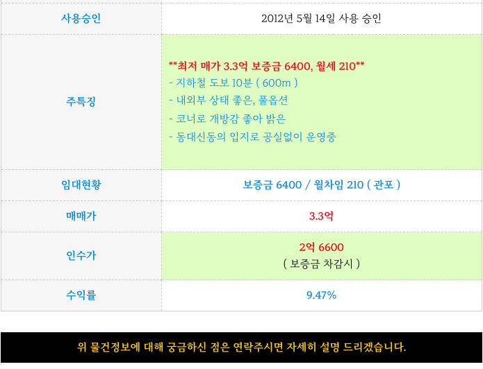 매매가 3.3억 / 보증금 6400 / 월세 210만원 으로 2억 6400 인수 할 수 있는 물건으로