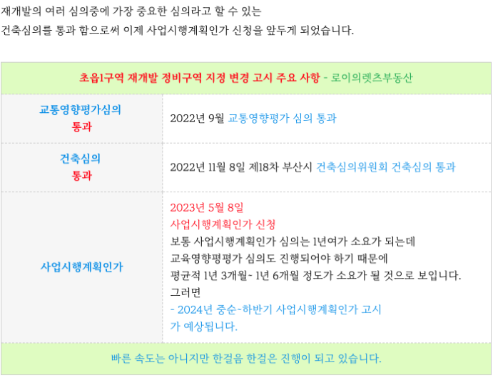 초읍1구역 재개발 은 지난 5월에 사시 신청이 되었고 현재 심의 중에 있습니다.