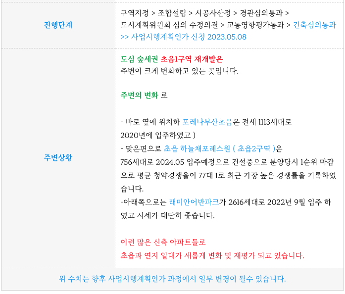 초읍1구역 재개발의 현재까지의 진행상황을 정리등 추가 정보는 아래 페이지를 참고 부탁드립니다.