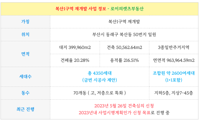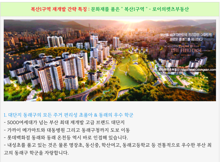 동래구 복산1구역 재개발 의 특징을 다시 한번 간략히 정리하였습니다.